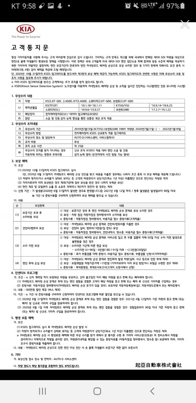 이 내용 중에서 유의해 봐야 할 내용은 "국내에서 판매된 세타2 GDI 차량을 대상으로 엔진(숏 블록 어셈블리) 평생 보증 정책을 시행" 한다는 말과 "엔진 커넥팅 로드 베어링 손상으로 유상 수리한 경우"도 보증을 해 준다는 말입니다.